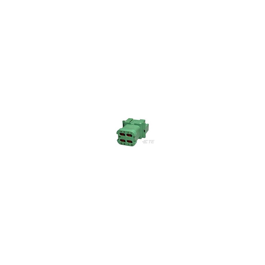 Tělo vodotěsného konektoru řady DT DT 04-08 PC-CE01 značky DEUTSCH je Konektor pro 8x kolík #16; e-seal; end cap; klíč C; zelený řady DEUTSCH DT patřící do kategorie Automotive Housings.