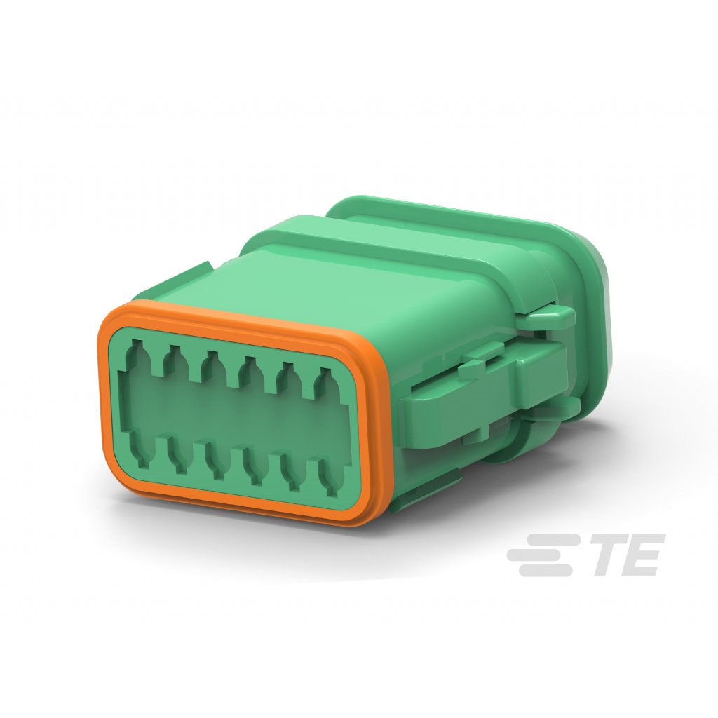 Tělo vodotěsného konektoru řady DT DT 06-12 SC-CE04 značky DEUTSCH je Konektor pro 12x dutinka #16, e-seal; konc.pro smršť. hadici; klíč C; zelený řady DEUTSCH DT patřící do kategorie Automotive Housings.